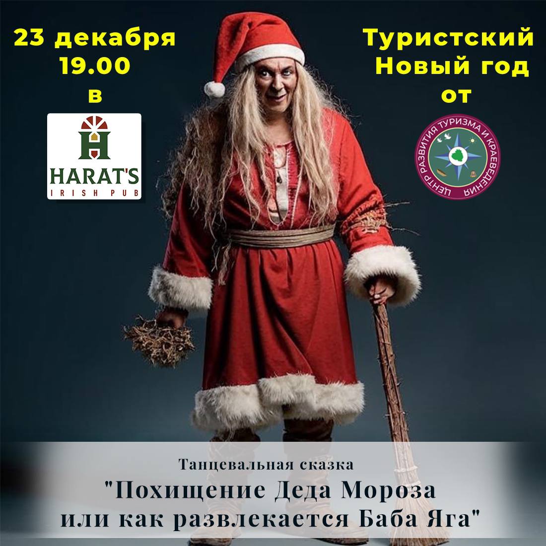 с 21:00 до 21.45 пройдет интерактивная танцевальная сказка "Похищение Деда Мороза или как развлекается Баба Яга". Коллектив АНО ЦРТК подготовил для вас захватывающее представление, где зрители станут активными участниками событий и помогут Деду Морозу выпутаться из сложной ситуации, в которую он попал, хотя мы говорили ему, говорили: «кабаки и бабы, доведут до цугундера»!